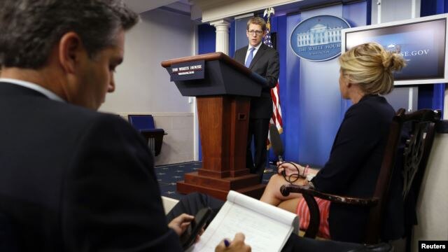 | El portavoz presidencial, Jay Carney, responde a preguntas durante una rueda habitual de prensa en la Casa Blanca. |
