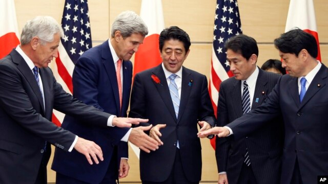 | El primer ministro japonés, Shinzo Abe (centro) prepara juntar las manos con los secretarios Chuck Hagel y John Kerry, de EE.UU. y sus contrapartes, Fmio Kishida y Itsunori Onodera. |